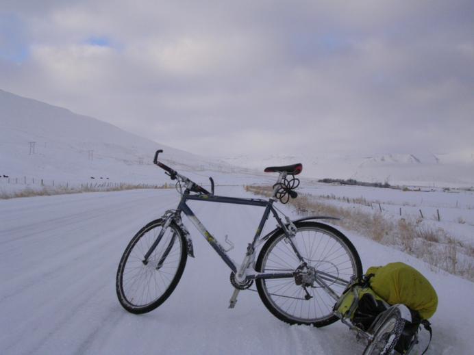Mein Rad bei einigen hilfreichen Wegweisern im Svarfaðardalur