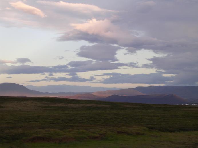 Hverfell und die umliegenden Berge bei Abenddämmerung