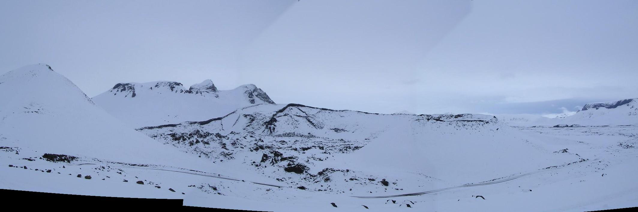 Blick über den schneebedeckten Fjallabak Nationalpark mit dem Krater Víti darin.