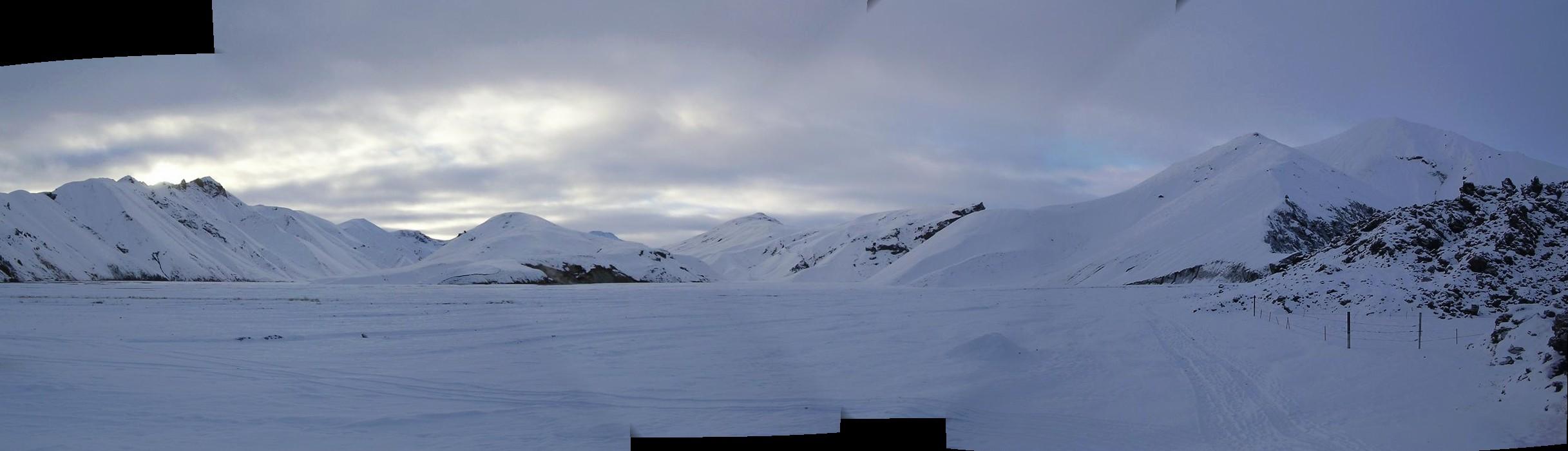 Das Tal des Jökulgílskkvisl bei Landmannalaugar mit Schnee und ein wenig blauem Himmel darüber.