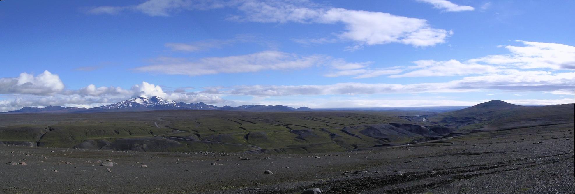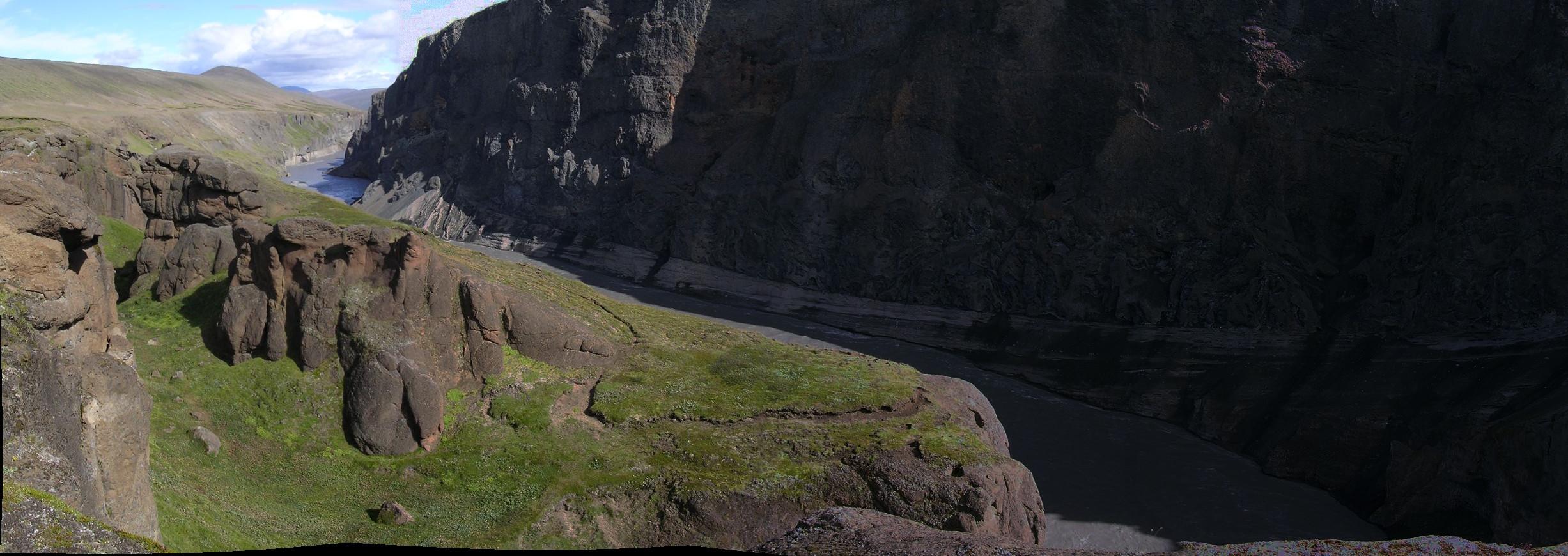 Die (gut versteckte) Schlucht Dimmugljúfur, die Kárahnjúkar-Gipfel, Snæfell und die noch zukünftige Staudammbaustelle.