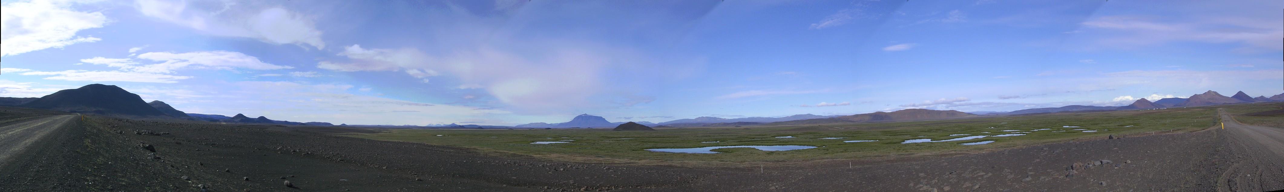 Die grüne Ebene rund um Möðrudalur an der Straße 901, mit freier Sicht auf den Herðubreið.