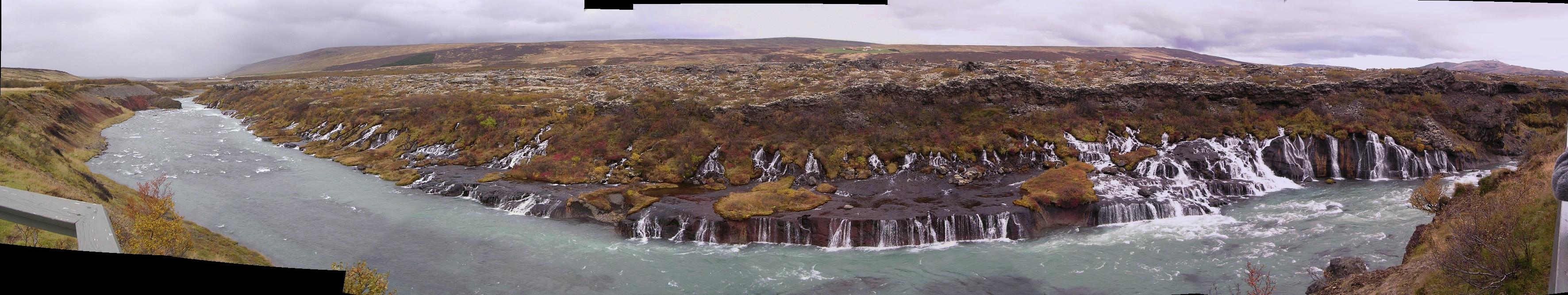 Herbstfarben bei den Wasserfällen Hraunfossar in Westisland.