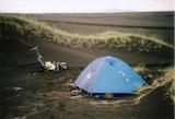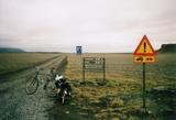 Die Nacht die ich dort in der Wüste Ódáðahraun verbrachte werde ich wohl nie vergessen. Obwohl ich nur 10 Meter von der Straße entfernt campierte hörte ich die ganze Nacht über nichts. Absolut nichts. Nichtmal Wasserplätschern oder wenigstens Wind der im Gras raschelt. Von Vögeln natürlich sowieso keine Spur. Als ich am nächsten Morgen dann wenigstens ab und zu ein paar Nebeltröpfchen gegen die Zeltwand prasseln hörte war das irgendwie beruhigend, daß es doch noch mehr Geräusche als das vereinzelte Rascheln des Schlafsackes gibt auf dieser Welt. Als ich dann hinausschaute war ich weniger begeistert von den "vereinzelten Nebelschwaden". Genaugenommen umgaben die mich nämlich vollkommen und ich konnte gerade noch die 10 Meter bis zur Straße zurück ausmachen. Mehr nicht. Vielleicht verziehen sich die Wolken ja noch? Außerdem war es geradezu unheimlich kalt. Als ich meine Sachen zusammengepackt hatte war ich durchgefroren wie selten zuvor in diesem Urlaub. Am Ende das Zelt naß und sandig zusammenzurollen und alles auf meinen Anhänger zu packen, das fiel mir unheimlich schwer. Kurz und gut, mit dem nicht funktionierenden Kocher vom Vorabend zusammengenommen hatte mich meine Lust auf Hochland und Askja irgendwie verlassen. Und was hat man schon davon, wenn man da ist und doch nur 10 Meter sieht und dann Nebel? Ich beschloß also, lieber umzudrehen und zur Ringstraße zurückzufahren und die gemütlichere Alternative entlang der Ringstraße nach Egilsstaðir zu nehmen. Askja war wiedermal vertagt auf den nächsten Urlaub oder so. Als ich dann nach etlichen Kilometern Radfahren immer noch fror und nicht etwa langsam warm wurde, wagte ich nichtmehr dran zu denken, wie angenehm warm ich wohl die Furten bei dem Wetter empfunden hätte. Im Laufe der Zeit wurde mir aber dann doch ein wenig wärmer, als ich auf der Ringstraße entlangfuhr sah ich im Süden über der Ódáðahraun dicke Wolken tief aufliegen, den Stumpf des Herðubreið hatte ich nicht ausmachen können bisher. Dafür stiegen die Wolken langsam mehr und mehr an und regneten sich dabei ab. Als dann einige helle Flecken Sonnenlicht sogar tolle Regenbogen überall hinzauberten, da begann ich zu ahnen, daß das vielleicht sogar noch ein recht netter Tag werden könnte heute. Trotzdem, schon wieder umdrehen, das wollte ich nun auch nicht gerade. Also blieb ich auf der Ringstraße, bis zur Abzweigung der alten Ringstraße, die nach Möðrudalur führte. Die neue Ringstraße verläuft einige Kilometer weiter nördlich. Aber der einsame Hof Möðrudalur mit dem manchmal herrlichen Blick auf den Herðubreið, den wollte ich doch noch besuchen. Und als ich mich der kleinen grünen Oase näherte, ärgerte ich mich richtig, daß der Blick auf den Herðubreið heute wohl wirklich noch so herrlich wie sonst nur auf Postkarten werden würde. Immer mehr Sonne kam durch immer größere blaue Flecken am Himmel. Und es wurde wieder richtig warm. Irgendwie war ich leicht geknickt, als ich dann in dem kleinen Kaffee des Ortes meine Mittagspause machte und mich das Hochland im Süden hell und sonnig anstrahlte. Ich tröstete mich damit, daß ich ja beim nächsten Versuch vielleicht mehr Glück mit dem Wetter hätte, und versuchte den restlichen Tag wenigstens noch zu genießen. Wettermäßig war ich gut dran, nach den paar kleinen Schauern vom vormittag und ich war so früh aufgebrochen, daß ich wohl noch eine ganze Ecke weit kommen könnte. Und laut meiner Karte würde in etwa kurz hinter Möðrudalur noch eine Hochlandpiste abzweigen, die F 905, auf der ich vielleicht wenigstens noch zum Snæfell in Ostisland gelangen könnte. Nach dem obligatorischen Besuch im kleinen Kirchlein vor Ort und wie gesagt einer Mittagspause brach ich also wieder auf und kam nach vielleicht zwei Kilometern auf meine Abzweigung. Dort steht auch eine Informationtafel, wie es sie überall in Island gibt, und dort standen auch zwei Radler, die ersten seit geraumer Zeit. Und ich kannte sie, auch wenn ich eine Weile brauchte um sie auch zu erkennen. Es waren die beiden, die in Landmannalaugar gerade aufbrachen als ich ankam, und neben denen ich in Nýidalur mitten in der Nacht mein Zelt aufgebaut hatte. Wir hatten seither in etwa die selben Ziele gehabt, erst zum Mývatn, dann waren sie allerdings gleich auf die Öskjuleið gefahren, ohne Abstecher zum Dettifoss, hatten auch nicht umgedreht, sondern waren durchgekommen zur Askja. Und nun kamen sie von dort zurück und mir entgegen. Neben allerlei anderen Neuigkeiten die wir austauschten, erzählten sie mir vom Straßendienst der gerade die Hochlandstraßen in der Gegend ein wenig aufräumte. "Mit Schneeschiebern" wie sie sagten, werden die größeren Bodenwellen und Steine beiseitegeräumt und so hatten sie eine gute Piste hinter sich, auf der man schnell vorankäme. Ermutigt brach ich dann also auf, vielleicht begegneten mir ja auch die Leute vom Vegagerðin in ihren Schneeräumern. Die Piste war jedenfalls tatsächlich in bestem Zustand. Also für eine Hochlandpiste jedenfalls. Zusammen mit dem mittlerweile recht blauen Himmel machte es richtig Spaß dort entlangzufahren. Auch die kleinen Furten die ich bald zu durchqueren hatte trübten die Freude nicht. Durch die ganz kleinen konnte man problemlos durchradeln, die größeren waren auch noch recht einfach zu durchschieben. Und die Landschaft schien mir nicht ganz so öde zu sein wie entlang der Sprengisandur. Ein wenig hügelig war es zwar, aber das nahm ich gerne in Kauf. So zügig wie es vorwärts ging kam ich schon bald an die nächste Kreuzung. Entweder konnte ich auf der F 910 Richtung Askja fahren, oder in Richtung Brú und Ostküste. Und eigentlich wollte ich zur Ostküste und dann außenherum entlang der Küste zurück zum Flughafen. Aber erstmal legte ich wieder eine kleine Pause ein. Denn hier an der Kreuzung hatte ich die "Schneeräumer" gefunden, die die Straße hinter mir so schön geebnet hatten. Die hatten schon Feierabend gemacht für heute u