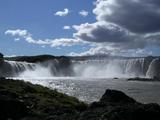 Am nächsten Morgen war der Regen vollständig verschwunden. Zwar war es anfangs noch ein wenig bewölkt, aber daß sich das bald lichtet war nicht schwer zu erraten. Also verabschiedete ich mich von meinen vielen Bekannten am Zeltplatz und verabredete mich mit den globebikern in zwei Tagen am Mývatn, sie wollten unterwegs am Goðafoss noch übernachten. Und ich hatte meine Freude am Packen und endlich mal eine Menge unnützes Zeug weniger und radelte somit bald mit meiner kurzen Hose munter drauf los. Ich hatte mit den anderen Radlern ein paar alternative Routen diskutiert, abseits der Ringstraße. Zum einen gibts einen hohen Pass über die Vaðlaheiði, aber auf Berge hatte ich heute keine rechte Lust. Zum anderen gibt es einen Weg auf 83 und 835 zunächst nach Laufás und dann an der Fnjóská entlang. Alle Wege führten aber dann am Ljósavatn vorbei und zum Goðafoss. Ich musste mich vorerst noch nicht festlegen und radelte erstmal auf der Ringstraße am Eyjafjörður entlang nach Norden. Dabei hatte ich starken Rückenwind, aus Süden also. Und eine Menge Sonnenschein natürlich auch. Trotzdem kam ich nicht so recht in die Gänge und mir lag das reichhaltige Abendessen vom Vortag noch schwer im Magen. Naja, also machte ich ausgiebige Pausen, genoss ein wenig das schöne Wetter und die tolle Aussicht über den sonnigen Fjord. Irgendwann kam ich dann an die besagte Abzweigung. Der Weg im Norden herum war ein wenig länger und ein wenig flacher, die Ringstraße führte geradewegs über einen recht beeindruckenden Pass. Andererseits könnte man den Berg auch wieder hinunterrollen, auf dem Umweg im Flusstal hätte man im anderen Seitental sicherlich ne Menge Gegenwind. Nach ein wenig hin- und herüberlegen entschied ich mich schließlich, hier noch auf der Ringstraße zu bleiben. Die anderen beiden Wege könnte ich sicher noch während meines Semesters in Akureyri ausgiebig erkunden. Also ging es langsam und zäh den Berg hinauf, dafür mit immer besserer Aussicht. Ich gönnte mir wieder viele Pausen, aber schließlich kam ich auch so auf den Gipfel. Dort hatte ich dann eine tolle Aussicht auf den Fluss Fnjóská vor mir. Das besondere an dessem Tal ist, daß es an den Hängen viele "Wälder" gibt, im isländischen Sinne des Wortes. Laut Karte gab es irgendwo dort unten wohl auch noch eine Abzweigung zum Vaglaskógur, dem größten und ältesten der verstreuten Waldstücke. Aber auch da wollte ich ein andermal hin. Abgesehen von dem Ausblick hatte sich die Straße nun wieder nach Süden gewendet, dem Wind entgegen. Und der blies wirklich recht ordentlich heute. Solange es noch bergab ging hatte ich keine ernsthaften Probleme, aber dann ging es wiedermal nur recht zäh vorwärts. Irgendwann kam ich aber trotzdem zur nächsten Straßenbiegung. Die Ringstraße führte nun wieder geradewegs nach Osten, zum Ljósavatn. Außerdem war hier die besagte Abzweigung zum Vaglaskógur. Und genau an der Kreuzung lud mich erstmal ein kleiner Parkplatz zum Rasten ein. Auf dem Weiterweg hatte ich deutlich weniger Probleme mit dem Wind. Mit Sonnenschein und blauem Himmel insgesamt ein sehr angenehmes Stückchen Ringstraße, der Verkehr hielt sich einigermaßen in Grenzen. So kam ich bald an den höchsten Punkt der Ljósavatnsskarð, von einem Gipfel oder Pass kann man bei dem recht flachen Tal nicht wirklich reden. Vor mir konnte ich den See Ljósavatn erahnen, dahinter die mir vertrauten Berge bei Fosshóll am Goðafoss. Mit dieser Aussich kam ich gleich noch ein wenig munterer voran, am Ufer des Sees wartete dann der nächste Parkplatz darauf, daß ich eine Rast machte. Das letzte Stück zum Goðafoss war auch nicht mehr problematisch. Dort, bei meinem persönlichen Lieblingswasserfall, war dann zwangsläufig ein kurzer Fotostop fällig. Ich war zwar schon etliche Male hiergewesen, aber noch nie hatte ich so einen klaren sonnigen Tag erwischt wie heute. Mit einem Eis in der Hand spazierte ich am ruhigen Ostufer entlang, während drüben mehrere Busladungen die ganze Gegend übernahmen. Ich probierte auch endlich mal ein wenig mit dem Selbstauslöser herum, wenn man schon eine Digitalkamera hat und die Bilder gleich wieder löschen kann. Aber es war erst früher Nachmittag, also zog ich nach einer Weile wieder weiter. Noch ein letztes Stück Ringstraße über den nächsten Hügelzug musste ich hinter mich bringen. Dieser Hügelzug ist von ganz anderer Art als die vorigen Berge rund um den Eyjafjörður. Dort hinter mir waren in den Bergflanken deutliche Schichten zu erkennen, hier war alles ein einziger gleichmäßig geneigter Hang, der geologisch gesehen wohl auch wieder völlig anders entstanden ist. Aber bergauf ging es trotzdem, wenn auch nicht ganz so lang und steil wie zuvor. Auf der anderen Seite ging es gleich wieder hinab ins Reykjadalur. Auch diese Gegend war mir schon vertraut, und so wollte ich den normalen Weg auf der Ringstraße und am Másvatn vorbei diesmal umgehen. Als ich also den Berg vollständig hinuntergerollt war, bog ich nicht nach rechts ab, sondern nach links, auf einer Straße mit Nummer 845 Richtung Húsavík. Die Straße führte das Reykjadalur in der anderen Richtung entlang, vorbei an einem Vestmannsvatn und dann ins Aðaldalur. Der Abschnitt den ich darauf entlangfuhr war nicht asphaltiert. Aber dafür hatte ich einen kräftigen Rückenwind. Ich konnte fast Wettrennen fahren mit den wenigen Autos die mich aber irgendwie doch noch überholten. Die Landschaft rund um den Vestmansvatn erinnerte mich schon ein wenig an den Mývatn meinem Tagesziel. Bizarre Lavaformationen und -säulen ragten hier aus den grünen Weiden heraus, mindestens so schön wie andernorts. Ich hatte also mehr oder weniger zufällig eine wunderschöne Alternative zur Ringstraße gefunden, und mit dem wunderschönem Sonnenschein darüber richtiges Wetterglück. Und außerdem hatte ich wie gesagt Rückenwind, der mich schon nach einer Viertelstunde zu meiner nächsten Abzweigung getragen hatte. Eine weit