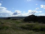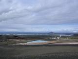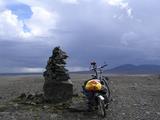 Am nächsten Morgen hab ich also nochmal zu Hause in Deutschland angerufen, mich vom globebike-Team nebenan verabschiedet und zusammengepackt. Und ich war nochmal einkaufen und Tanken, 30 ISK für meinen Benzinkocher, mit Karte bezahlt, macht sich gut am Kontoauszug. Es war ein wenig zugezogen über Nacht, aber ich vermutete, das würde sich recht bald wieder lichten, denn der Südwind blies schon kräftig. Deswegen entschied ich mich auch wieder für die kurze Radelhose. Die ersten paar Meter fielen mir wie üblich ein wenig schwer, noch dazu ging es hinter dem Kieselgurkraftwerk von Reykjahlíð gleich auf einen kleinen aber steilen Pass hinauf. Oben am Parkplatz mit der schönen Aussicht folgte also gleich die erste Pause des Tages. Und während ich da stand und einen Blick zurück über Dampfschwaden, Kieselgurkraftwerk, See und Vindbelgjarfjall warf, kam auch schon der erste Touristenbus des Tages. Die Insassen, auch Deutsche, liefen zunächst ein wenig ziellos umher und machten alle einen Bogen um mich herum. Schließlich kam aber doch einer von denen auf mich zu und sprach mich an, mit "Sie" statt dem an Zeltplätzen und anderswo üblichen "Du". Bald wurden die anderen auf mich aufmerksam und ich war umzingelt. Immerhin, der mutige Sprecher erzählte er wäre schon zigmal in Island gewesen und hätte auch Freunde in Akureyri, die er besuchen fahren würde "wenn das hier rum ist" und und und. Warum er trotz seiner offenkundlicher Erfahrung nicht auf eigene Faust das Land erkundete, wundert mich ehrlichgesagt noch heute, aber allzubald schon wurde die Reisegruppe wieder eingeladen und im Bus verstaut und es ging weiter. Auf der anderen Seite des kleinen Passes kam ich sogleich an die Abzweigung zu "den heißen Quellen am Námafjall", Hverarönd, viele andere Namen hab ich auch schon gehört. Ich beschloß jedenfalls nach keinen 5 Kilometern Tagesleistung schon die zweite Pause zu machen. Genaugenommen hatte ich diesen Touristenmagnet bisher erst einmal bei meinem ersten Mývatnbesuch gesehen und seither andere Flecken rund um den See bevorzugt. Aber wenn mich schon die Route hier vorbeiführte, könnte ich auch artig ein paar Bilder schiessen und ein wenig Schwefelgeruch und Dampfschwaden bestaunen. Und zuschauen wie eine Mietwagenbesatzung nach der anderen mein am Parkplatz abgetelltes Gespann besichtigte. Den Abstecher auf der anderen Seite in Richtung Krafla sparte ich mir aber heute. Während meines Aufenthaltes in Akureyri würde ich bestimmt noch das eine oder andere Mal in der Nebensaison Zeit haben für diese Sehenswürdigkeit. Stattdessen machte ich mich endlich auf, ein paar Kilometer hinter mich zu bringen. Die Ringstraße führt vom Mývatn geradewegs nach Osten. Rechts hatte ich das Lavafeld Búrfellshraun und konnte an dessen Südende genau die Berge ausmachen, bei denen ich gestern herumgewandert war. Links von mir lagen einige flache Hügel mit grünen Schafsweiden an den Hängen und unbekannte Weiten dahinter. Und direkt neben der Straße fielen mir auch bald die Steinhaufen auf, die in regelmäßigen Abständen die alten Wege markierten. Anderen Geschichten zufolge wurden sie auch nachträglich von einigen Bauarbeitern zum Spaß errichtet. Das Wetter wurde, wie erwartet, immer besser und sonniger, der Südwind störte mich noch nicht so sehr, noch kam er von der Seite. Und so kam ich bald an die Abzweigung der F862, der Piste am westlichen Ufer der Jökulsá á Fjöllum Richtung Dettifoss und Ásbyrgi. Für heute ließ ich diese aber links liegen, auch dort würde ich von Akureyri aus sicher nochmal hinkommen. Und hinter dem nächsten Hügel sah ich auch die Nebelschwade des Dettifoss austeigen, also war dort wohl nach wie vor alles in Ordnung, wie im letzten Jahr. Die Gegend wurde ein wenig staubiger, sandiger und trockener als es hinabging Richtung Jökulsá. Rechts der Straße konnte ich bald auch den Ringkrater Hrossaborg erkennen. Von dort zweigte die F88 Öskjuleið Richtung Herðubreið, Askja und Sandwüste ab. Das Warnschild sprach von 268km ohne Tankstelle, von Zelten verboten und von Naturschutzgebiet. Aber auch diese Piste ließ ich vorerst in Ruhe. Vielleicht würde ich in etwa zwei Wochen dort wieder herauskommen. Als ich diesen Weg letztes Jahr probiert hatte, wurde das Wetter dermaßen kalt, windig und verregnet, daß ich nach 10km wieder umgedreht hatte. Für heute ging es weiter auf der Ringstraße. Neben mir im Sand konnte ich schon eine ganze Weile Hufspuren verfolgen und wunderte mich mehrmals, ob das vielleicht meine Reitergruppe vom Vortag war. Aber bei der Brücke über die Jökulsá verloren sich die Spuren, keine Ahnung auf welcher Flusseite sie weitergeritten waren. Unter der Brücke tosten die graubraunen Wassermassen, staubiges Schmelzwasser von den Gletschern, die Sandwüsten am Flußufer anschwemmten anstatt grüne Oasen zu erschaffen. Auch der wechselnde Wasserstand zwischen Sommer und Winter macht es Vegetation schwer, sich zu halten. Auf der anderen Flusseite, hinter der abenteuerlich kleinen Brücke, machte ich meine nächste kurze Pause. Mittlerweile war ich doch ganz ordentlich vorangekommen, seit dem Mývatn heute morgen. Aber die weitere Ringstraße würde eher nach Süden führen, also gegen den Wind. Das konnte also noch eine anstrengende Strecke werden bis heute Abend. Das merkte ich schon ziemlich bald, als ich weiter radelte auf den Anstieg am Biskupsöxl zu. Während ich mich dort mühsam vorwärtskämpfte kam mir ein Radlerpärchen entgegen. Die hatten ein dermaßenes Tempo und fröhliches Lächeln drauf, daß ich fast ein wenig neidisch wurde. Für einen Halt mit kurzem Plausch hatten sie aber keine Zeit. Neben der Straße konnte ich einigen Staubfahnen zusehen, die der Wind über die abgelagerten Sandflächen jagte. Oben an dem kleinen Pass war der Boden aber schon wieder fest und grün bewachsen. Und hinter dem Pass Biskupsöxl lag ein kleines Tal in dem es sogar wieder verstreute Gehöfte gab. Dort hindurch führte 
