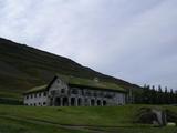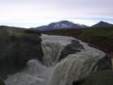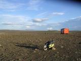 Der Himmel zog sich über Nacht wieder ein klein wenig zu und am nächsten Morgen blies ein kalter Südwind. Das kam mir nicht ganz ungelegen, denn für den heutigen Tag wollte ich nach Norden, Richtung Egilsstaðir. Aber mit dem Aufbruch konnte ich mir noch ein wenig Zeit lassen, dachte ich, und plauderte beim Packen noch ein wenig mit meinen isländischen Zeltnachbarn, die, wie sich herausstellte, allesamt fließend Deutsch sprachen. Als sich dann aber so langsam die ersten blauen Flecken zwischen den Wolken breitmachten, fuhr ich doch endlich los. Ich erwartete eigentlich, daß die Wolkenlücken bald größer und größer würden und mir ein sonniger warmer Tag bevorstünde. Das wäre typisch für Island, erstmal ein wenig wolkig, dann ab Mittag aber warm. Nun radelte ich auf der Piste entlang, erst etwa eine Stunde bei vielen Steinen und den fünf kleinen Furten, die ich schon kannte, und es wurde zwar sonniger aber definitiv nicht warm. Das war ärgerlich, denn ich hatte wiedermal meine kurze Radhose an. Leich durchgefroren kam ich so zur Kreuzung F909 mit F910, ab hier erwartete ich eine bessere Piste. Auf diese bessere Piste hätte ich aber gern verzichtet. Zum einen schon aus praktischen Gründen, die Straße war viel zu breit und ich kam mir ein wenig verloren vor. Außerdem war sie natürlich nicht umsonst so breit, sondern wurde regelmäßig von schweren LKW genutzt die scheinbar endlos hin- und herfuhren, mitten ins Nichts des Hochlandes. Als letzter Punkt störte mich an der neu gebauten Strecke, daß sie ausschließlich für das Staudammprojekt gebaut wurde. Um es kurz zu machen, auch wenn ich schnell vorwärtskam war mir das Autobahngefühl recht unheimlich. Bald schon zweigte ich wieder ab, auf eine kleine Seitenpiste in Richtung Osten, nach Laugarfell. Dort sollte ich laut Karte bald einen kleinen und einen großen Wasserfall, eine heiße Quelle und eine Hütte finden. Und tatsächlich war der Abstecher nicht weit. Dafür ging es am Ende recht steil bergab und unten war wiedermal eine kleine Furt. Da ich aber schon die Hütten sehen konnte und keine Lust hatte, nachher wieder bergauf zu schieben und all das, stellte ich mal wieder das Rad ab und machte mich zu Fuß auf. Unten bei den Hütten sah ich ein paar Jeeps herumstehen, aber die waren zunächst noch zu weit weg. Ich machte einen kleinen Bogen, abseits der eigentlichen Straße, um den versprochenen kleinen Wasserfall, Slæðufoss, zu besuchen. Als ich dann weitermarschierte brachen die Jeeps unter mir auf und fuhren von dannen. Auch gut, hab ich die Landschaft wieder für mich alleine. Auch den kleinen Bach zu überqueren war dann kein Problem, und so stand ich bald vor den Hütten. Dazwischen lagen überall riesige Kabelrollen herum, als sollte das hier einen Telefonanschluss geben. Einige der Hütten waren wohl Pferdestall und machten einen recht heruntergekommenen Eindruck. Aber in der Haupthütte fand ich noch ein Gästebuch zum reinschreiben und schmökern. Die heiße Quelle war ein wenig abseits und schwerer zu finden. Es dampfte auch nicht so schön aus ihr, wie das oft üblich ist. Es dauerte also eine Weile, bis ich den schön hergerichteten kleinen Pool fand, mit gemauerten Steinen rundherum und einer Plane obendrauf. Er machte einen schön warmen Eindruck, und bei Gelegenheit muss ich da mal eine Tagesetappe ausklingen lassen. Aber heute nicht. Heute wollte ich noch eine kurze Wanderung zu dem "großen Wasserfall" unternehmen, der auf der Karte als Kírkjufoss eingezeichnet ist. Ich konnte nur die ungefähre Richtung erahnen, Südosten, Pfad oder gar ein Hinweisschild gab es nicht. Das heißt, einen kleinen Pfad gab es schon, dem folgte ich eine Weile durch eine recht sumpfige Wiese, über einen kleinen Bach, aber dann hab ich die Spur irgendwie verloren. Also mußte ich auf eigene Faust weitermarschieren. Von dem Wasserfall sehen oder ahnen konnte ich lange Zeit nichts, denn vorher musste ich noch über einen kleinen Hügel hinüber. Auf der anderen Seite sah ich das tief eingeschnittene Tal der Jökulsá í Fljótsdal, also schonmal den Fluss den ich suchte. Auch die Nebelfahne des Kírkjufoss konnte ich erahnen, meine Richtung war einigermaßen genau richtig. Nur machte ich jetzt trotzdem einen kleinen Bogen, denn auf dieser Seite des Hügels lag eine sumpfige Wiese, die zu durchqueren ich keine Lust hatte, mit meiner Radlermontur und ohne meine Wanderstiefel. So ganz gelang mir das nicht, also stand ich bald mit nassen Füßen am Rand der Schlucht, unter mir etwa 30 Meter senkrechter Felsen, vor mir einer der mächtigen Gletscherflüsse Islands, der etwa diese 30 Meter in zwei Stufen in die Tiefe stürtzt. In der Mitte des Wasserfalls stand eine kleine Felseninsel, so daß es insgesamt einen recht eindrucksvollen Anblick ergab. Von der anderen Seite hat man aber wohl einen besseren Blick. Ausserdem wurde mir langsam kalt, mit meiner kurzen Radhose, dem kalten Südwind, den feinen Nebeltröpfchen überall. Also drehte ich bald um, hatte noch eine Weile kleine Stöckchen als Wegmarkierung, kreuzte wieder einen ausgetretenen Wanderpfad ohne Stöcke und überkletterte den Hügel und kam zurück zu den Hütten Laugarfell. Im Hot Pot wärmte ich meine Füße ein wenig auf, bevor ich wieder durch den kalten Bach musste. Mittlerweile war es wieder menschenleer rund um mich, daß etwa 3 Kilometer vor mir, den Berg hinauf, die Neubaustrecke zu den Kárahnjúkar von unzähligen LKW genutzt wurde, war kaum vorstellbar. Trotzdem, als ich die kurze Stichstraße zurückgeradelt war und wieder auf die F910 Richtung Egilsstaðir einbog stellte sich unweigerlich wieder das Autobahngefühl ein, insbesondere weil ich mit dem Südwind im Rücken auch entsprechend zügig vorankam. Die Straße war noch nicht durchgehend asphaltiert, so hatte ich zunächst festen Sand mit Steinen unter mir. Bald kam ich an eine Baustelle, etwa einen halben Kilometer lang gröbere Steine, das Fundament für den späteren Asphalt. Als ich das