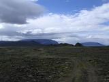 Für den nächsten Tag hatte ich wiedermal einen Ruhetag eingeplant. Was aber nicht heißen sollte, daß ich mir nichts vorgenommen hatte. Genaugenommen war mir gestern abend im Kochzelt schon zum wiederholten Male ein großes Poster aufgefallen von einer "guided tour" zu einer Eishöhle namens Lofthellir, irgendwo hier in der Nähe. Mit angeblich wunderschönen Eisskulpturen. Nur kostet die Tour 6000 ISK, was mir eindeutig zu viel ist. Also wollte ich mich mal selber auf die Suche nach der Eishöhle machen. Ich wußte von der Tourbeschreibung ungefähr daß ich am Hverfjall vorbei, weiter nach Osten zu einem Hvannfell musste und dann etwa eine halbe Stunde ohne Straße durch ein Lavafeld mit "schier endlosen Stricklaven" wandern musste. Das klingt nach nicht sehr viel Anhaltspunkten, war aber eben alles was ich wusste. Jedenfalls schien mir das das richtige Unterfangen zu sein für einen schönen sonnigen warmen Tag, wie es heute einer war. Ich brach also auf, mit Wanderstiefeln und Fahrrad, ohne Gepäck. Das erste Stückchen lag auf der Ringstraße, aber nur etwa 2 Kilometer, bis ich an die Abzweigung zum riesigen Krater Hverfjall kam. Dieser Krater fällt zwangsläufig auf wenn man am See ist. Er ist kreisrund und ein nahezu perfekter Bilderbuchkrater. Auch das Raufklettern und Rundherumlaufen lohnt sich, man hat meistens eine tolle Aussicht von dort, das ist bekannt. Was aber nur die wenigsten wissen ist, wie das Ding eigentlich entstanden ist, und ich hab auch ewig gebraucht bis ich das herausgefunden hatte... aber das ist eine andere Geschichte... :) Jedenfalls, statt der normalen Straße zum Parkplatz mit dem Pfad auf den Kraterrand zu folgen, bog ich nach rechts ab um am Krater vorbeizufahren. So schön er auch ist. Statt dessen radelte ich in Richtung der Kraterreihe Ludentarborgir. Von einem australischen Bekannten (die Geschichte dazu kommt später auch noch) wußte ich immerhin schonmal von einigen schönen Spalten, die bald die Straße kreuzten und ein schönes Fotomotiv für den Selbstauslöser bieten. Dann endete mein Wissen aber bald und laut Karte die Piste auch. Ich radelte einen kleinen Hang auf die Kraterreihe hinauf und zu meiner Überraschung gabelte sich dort die Piste. Was nun? Sicherlich konnte ich kein vorbeikommendes Auto anhalten und fragen. Während sich hinter mir am See die Touristen austobten war hier absolut nichts und niemand unterwegs. In dementsprechenden Zustand war dann auch die Piste. Die nach rechts sah aber noch ein wenig besser aus, also folgte ich der. Das war ein heidenspaß, bei Sonnenwetter auf dieser Strecke unterwegs zu sein, mit festem Untergrund und fast gänzliche ohne Steine. Weniger spassig fand ich, daß sich die Straße bald schon wieder gabelte. Die eine führte zwar genau in die richtige Richtung, geradewegs nach Osten zum Hvannfell. Aber sie machte einen so mieserablen Eindruck, daß ich lieber noch ein Stückchen weiter nach Süden radelte. Um es kurz zu machen, ich hatte eine wunderschöne und sehr abwechslungreiche Landschaft um mich. Irgendwann, nach noch ein paar Gabelungen und Kreuzungen ließ ich mein Fahrrad an der Straße zurück und marschierte zu Fuß auf einen Berg hinauf. Von dort hatte ich eine wunderbare Aussicht auf den ganzen See und all die Sehenswürdigkeiten um ihn herum, auf der anderen Seite war eine eindrucksvolle Schulcht, vermutlich die Seljahjallagjá, aber den Namen habe ich bisher nur auf einer 1:100.000 Karte gesehen. Aber ich musste auch einsehen, daß das alles hier absolut nicht zum Hvannfell führte und schon gar nicht zu meiner Eishöhle. Also drehte ich wieder um. Am Rückweg sah ich Hufabdrücke, sehr frisch. In der Zwischenzeit war ein Reitertrupp hier durchgekommen. An der oben genannten zweiten Abzweigung waren sie geradewegs zum Hvannfell geritten. Aber mir war dieser Weg einfach zu schlecht, also fuhr ich weiter zur ersten Gabelung zurück. Fälschlicherweise, wie ich heute weiß. Während ich dann also meinen Weg entlangfuhr wurde mir langsam klar, daß einige der Gabelungen und Wege um ein rechteckiges, eingezäuntes Weidegebiet herumführen. An dessen Südseite waren die Reiter auf der richtigen Straße entlanggeritten, ich fuhr nun an der Nordseite entlang. Allerdings verlief sich der Weg irgendwann im wahrsten Sinne des Wortes im Sande. Also ließ ich mein Rad abermals zurück und machte mich zu Fuß auf, so weit ist das bestimmt gar nicht mehr. Das Lavafeld, das ich zunächst durchwanderte, war von bizarrer Schönheit. Teilweise mit Büschen und Sträuchern überwuchert, teilweise mit feinem weißen Treibsand aufgefüllt und teilweise blanke scharfkantige Felsen und große Krater von eingestürtzten Höhlen. Vor mir sah ich als klares Ziel die Nordflanke des Hvannfell, mit 671 Metern eine deutlich höhere Erhebung als sie das zerklüftete Lavafeld um mich zu bieten hatte. Außerdem sah ich nun den Reitertrupp, der gerade um diesen Berg herumritt. Das spornte mich an, aber zu Pferde kamen sie deutlich schneller voran als ich zu Fuß und so waren die schon längst hinter allen Bergen als ich gerade an deren Fuß ankam. Und dort fand ich auch die "Piste" wieder, die man wohl wirklich nur noch als Reitweg nutzen kann, so verfallen und überwuchert wie sie ist. Aber auch ein sehr angenehmer Wanderweg. Je weiter ich um den Hvannfell herumkam um so mehr veränderte sich das Lavafeld. Statt der zerklüfteten Brockenlava die ich vorhin durchwandert hatte, war es nun eher flach und mit den typischen dicken Strickfäden durchzogen, die beim Abkühlen von dünnflüssiger Lava entstehen. Aha, von dem Lavafeld hatte die Tourenbeschreibung also gesprochen. Ein ganzes Stück vor mir, etwa eine halbe Stunde Fußmarsch schätzungsweise, ragte der nächste Berg auf, Búrfell. Und dorthin hoppelten die vereinzelten rot und gelb leuchtenden Jacken des Reitertrupps, den ich in der Ferne wieder entdeckte. Bald konnte ich nur noch ihre Spuren sehen, sie selbst waren irgendwo von der Landschaft verschluckt. A