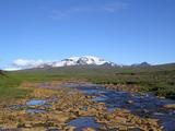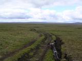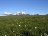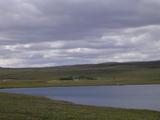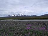 Am nächsten Morgen sah es immer noch recht regnerisch aus, dicke Wolken, gelegentliche Schauer, ungemütlich kalt. Eigentlich war ich den beschwerlichen Weg hierher geradelt, um ein wenig zu wandern. Ich wollte in die Vesturöræfi, ein üppiges Grasland zwischen dem Snæfell und der Jökulsá í Dal, das durch das Staudammprojekt teilweise verschwinden würde. In einigen Karten, eine ironischerweise von der isländischen Energiebehörde Landsvirkjun herausgegeben, war eine kleine Hütte Sauðakofi eingezeichnet, zu der es irgendeine Art von Piste zu geben schien. Soviel zu meinem Plan, den Tag begann ich erstmal mit einem Besuch in der Hütte, wo noch eine Wandergruppe eingekehrt war. Auch die hatten keine rechte Lust bei dem Wetter und warteten auf eine Besserung. Somit hatte ich bei einigen Tassen heißem Tee noch ein paar nette Gesprächsgelegenheiten, auch mit dem Hüttenwart. Der war tatsächlich aus Deutschland, lebte schon ein paar Jahre in Island und war diesen Sommer offensichtlich zum ersten Mal in der Hütte tätig. Er selbst war noch nie in der Vesturoræfi, konnte mir also auch nicht allzuviele Tips geben bezüglich dieser Piste. Naja, recht bald wurde mir das ewige Warten zu öde, draußen regnete es schon nicht mehr wirklich, nur noch dicke Wolken zogen übers Land. Und das von Süden. Der Wind hatte vom zwischenzeitlichen Osten gestern nachmittag mal wieder ein wenig gedreht. Mit etwas Glück klart das bald auf, meinte auch die Führerin der Wandertruppe, die heute noch den Snæfell besteigen wollten. Also machte auch ich mich startklar, umdrehen könnte ich immer noch. Ich zog meine dicken Wanderstiefel an, packte ein paar Kekse in den Rucksack und los ging es, mit Fahrrad aber ohne dem ganzen übrigen Gepäck versteht sich. Beinahe hätte ich mit dem "übrigen Gepäck" auch meine Furtsandalen vergessen, aber die könnten heute noch wichtig werden. Die Abzweigung meiner Piste hatte ich gestern schon in der Dunkelheit entdeckt, etwa 100 Meter bevor ich zur Hütte gekommen war. Heute radelte ich diesen reichlich steinigen Weg also entlang. Aber das ging eigentlich recht gut, die vielen Steine waren alle recht groß und man konnte wiedermal problemlos drumherum fahren, besonders wenn man kein Gepäck hatte. Ein paar kleine Bäche waren auch zu durchqueren, problemlos und noch ohne Watsandalen und nasse Füße machbar. Den Karten zufolge führte genau eine Piste über einen kleinen Hügelzug und auf der anderen Seite weiter zu einem Flüßchen Sauðá, das ich überqueren musste. Von einer zweiten Piste und einer Wegkreuzung, wie ich sie jetzt am Hang des Hügelzuges vor mir hatte, war nirgends die Rede gewesen. Bei einer kurzen Besinnungspause merkte ich erstmal, daß das Wetter dabei war, sich deutlich zu bessern. Im Süden hingen noch ein paar Wolken, aber hinter mir hatte ich schon ein paar Flecken blauen Himmel und ein wenig Sonnenschein am Snæfell. Weiterhin merkte ich, daß die Piste geradeaus zwar bergab und in die richtigere Richtung führte, aber auch in einem deutlich schlechteren Zustand war und vermutete, daß sie wohl irgendwo im Nichts enden würde. Also entschied ich mich erstmal für den steilen Bergauf-Weg. Dabei hatte ich eine immer bessere Aussicht auf die Wiesen am Fuß des Snæfell, aber was hinter dem Hügelzug auf mich wartete, konnte ich immer noch nicht sehen. Außerdem blieb die Vegetation hinter und unter mir zurück, die Piste führte zusehends in eine ödere und steinigere Landschaft. Und die Piste teilte sich bald schon wieder. Geradeaus, diesmal nach Süden, ging es offensichtlich in ein weiteres Tal mit viel Wasser, kleinen Seen, und dahinter dem Gletscher Vatnajökull. Die Alternative nach Westen war eher meine Richtung, also arbeitete ich mich ein Stück weiter bergauf. Bald kam ich aber ans Ende der Piste, ein kleiner Parkplatz, der mit vielen Stöcken markiert war. Von hier aus ging es höchstens noch zu Fuß weiter. Aber von hier aus hatte man auch eine hervorragende Aussicht auf die Vesturöræfi, die für mich so lange hinter den Hügeln verborgen war. Leider war das meiste zwar hinter Regenwolken verborgen, die sich am Nordrand des Vatnajökull abregneten, aber trotzdem konnte ich zwischendurch gelegentlich die markanten Kverkfjöll und den Herðubreið erkennen. Im Norden sah es dagegen schon richtig freundlich aus, hinter einer Reihe von Hügeln schien dort die Sonne. Und direkt zu meinen Füßen unter einem steilen Hang lag eine große grüne Ebene, durchzogen von unzähligen kleinen Bächen und Flüßen, Abflüße und Zuflüße für ebenfalls unzählige kleine und größere Seen. Irgendwo in der Ferne ging es bergab ins eigentliche Tal der Jökulsá, aber den Fluß selber konnte man nicht sehen. Vielleicht in ein paar Jahren, wenn sich dort der Stausee Hálslón ausbreitet... Außerdem konnte ich eine Piste erkennen. Offensichtlich der Weg, den ich bei der ersten Gabelung nicht genommen hatte. Also genoß ich noch ein wenig die Aussicht und stimmte mich in Gedanken schonmal darauf ein, umzukehren bis zur Abzweigung. Als ich wenig später dann auf der richtigen Piste unterwegs war merkte ich bald, daß diese zwar auf den ersten Blick weniger einladend aussah, hinter ein paar Kurven aber wieder besser wurde. Auf der westlichen Seite der Hügelkette ging es jetzt also bergab, das Wetter sah mittlerweile auch dort schon deutlich freundlicher aus. Und bald kam ich in eine grasbewachsene und grüne Gegend, und die Piste änderte deutlich ihren Charakter. Hatte ich oben in den Steinen noch lockeren Sand und eben Steine unter den Reifen, führte die Piste jetzt über richtige Erde, teilweise auch über Gras. Die Fahrspur war teilweise auch recht tief eingesunken ins Erdreich, mit einem breiten Gefährt ist das sicherlich eine Schaukeltortur, mit meinem Rad konnte ich mir immer die beste Spur heraussuchen und dort bequem entlangfahren. So kam ich bestens vorwärts und in die Vesturöræfi hinein. Und ich erreichte bald wieder eine Gabel