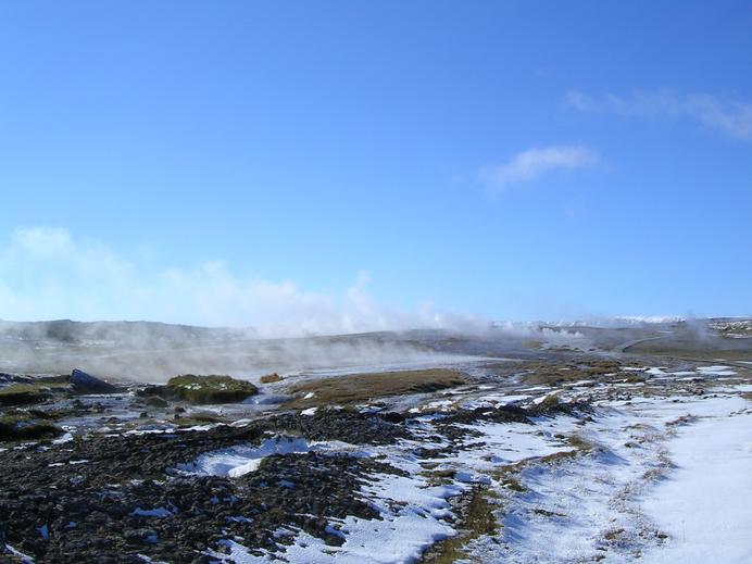 Eis und Schnee rund um die heißen Quellen bei Hveravellir