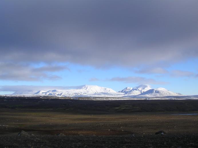 Die verschneiten Kerlingarfjöll über dem schneefreien südlichen Kjölur