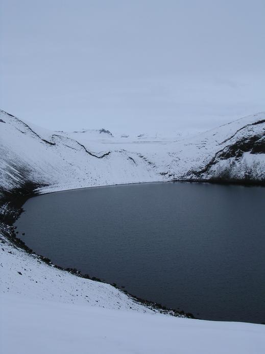 Der eingeschneite Krater Hnausapollur nördlich von Landmannalaugar