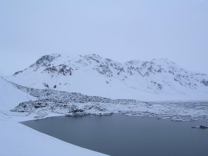 Der See Frostastaðavatn mit seinem markanten Lavafled bei Schnee