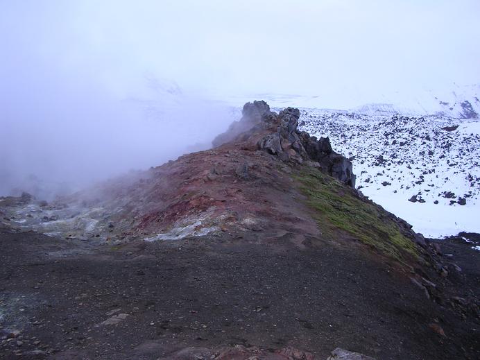 Heiße Quellen bei der Brennisteinsálda mit verschneitem Lavafeld dahinter