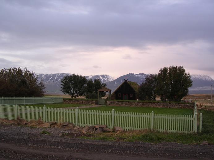Die Kirche Víðimýri mit schneebedeckten Bergen dahinter