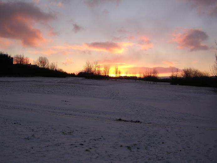 Sonnenaufgang über der verschneiten Zeltplatz von Reykjavík