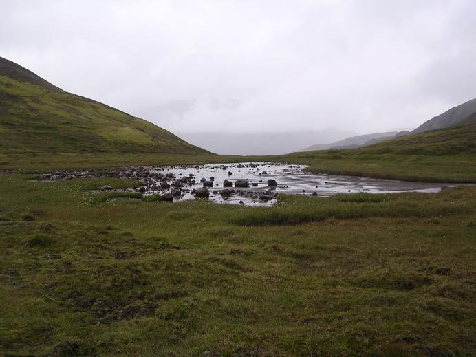 Ein typischer kleiner Bergsee mit Wollgras, in der Lónsöræfi