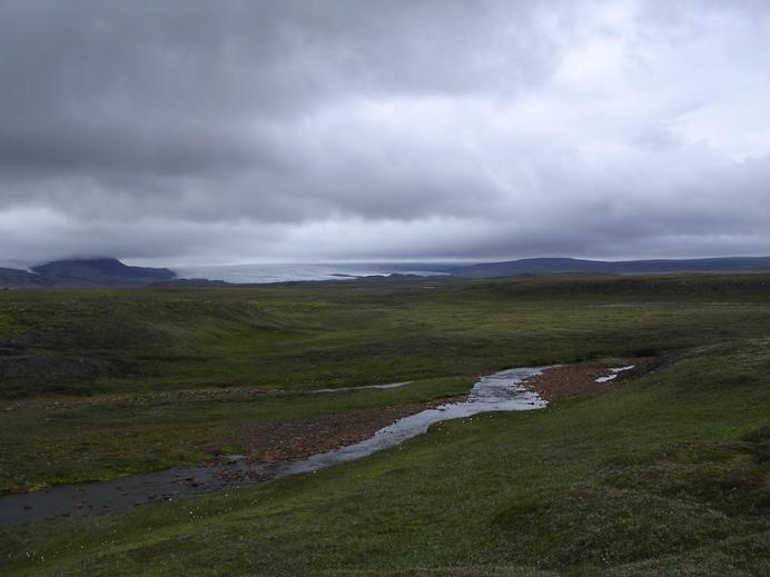 Einer von zahlreichen Zuflüssen zu den Eyjabakkar, im Hintergrund der Vatnajökull