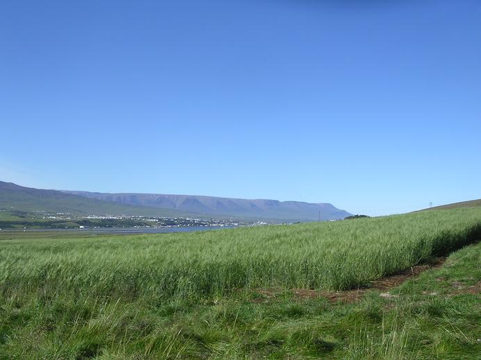 Kornfeld mit Blick auf Akureyri und die Hvammsfjöll