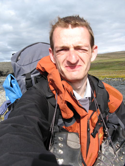 Meine Wenigkeit mit umgebundenen Wanderstiefeln beim Furten der Geldingsá