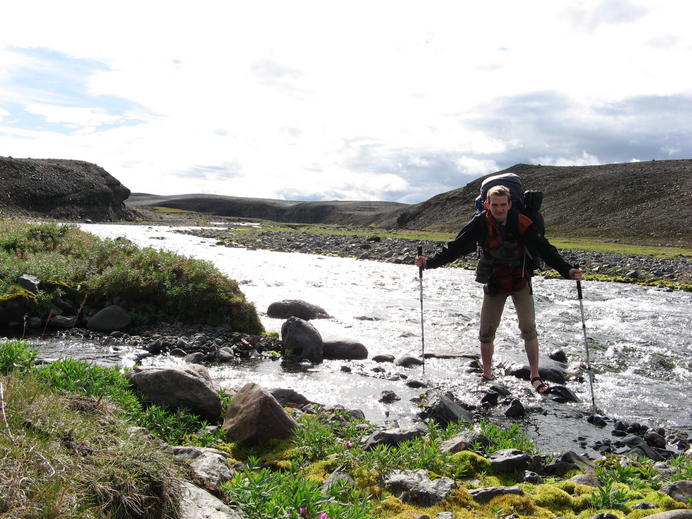 Ein verrückter Wanderer beim Furten der Geldingsá