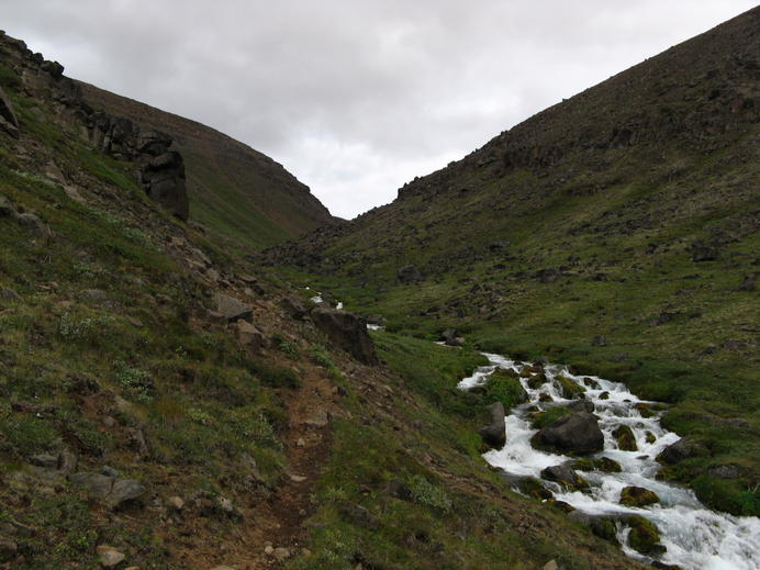 Der "Eingang" ins Hölknadalur, bewacht von finsteren Felsen