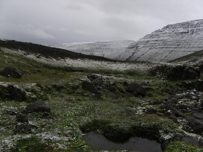 Abstieg aus dem Suðurárdalur ins Hjaltadalur bei Schnee