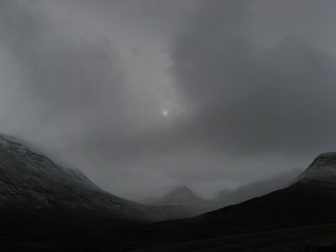 Nebel und Wolken über dem hintersten Ende des Hjaltadalur