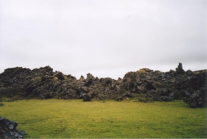Gras und Moos erobern die schwarzen Felsen eines Lavastromes zurück