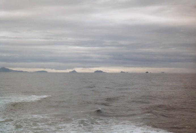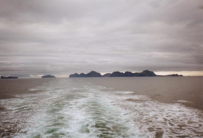 Die südlichen Vestmannaeyjar und links Heimaey