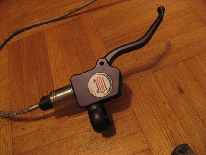 Zweites wichtiges Teilstück: der Bremshebel. Der passt an "normale" MTB-Lenker mit ichweißnichtwelchem Standarddurchmesser, wo eigentlich alles dranpasst. Die Befestigung ist allerdings modular an den eigentlichen Bremshebel drangeschraubt, andere Schellenduchrmesser kann man vielleicht auch einsetzen, ohne gleich den ganzen Hebel wechseln zu müssen. Abgesehen davon, dass alles seitenverkehrt ist, unterscheiden sich linker und rechter Hebel nicht. Und diese Unterschiede beziehen sich auch nur auf das Metallgehäuse, wähend Zylinder, Bremsgriff und alles andere gleich ist. Also einfach dranschrauben und losfahren.