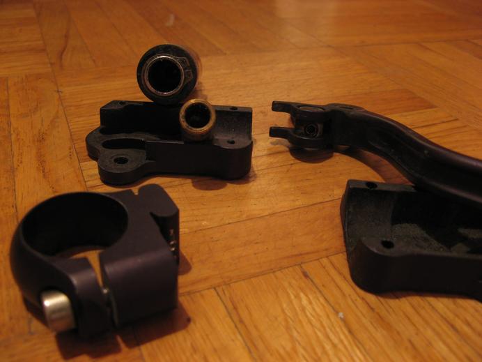 Der eigentliche Hebel (das Ding, woran man zieht, also der Bremsgriff) ist auch wieder mit einer Schraube an den ganzen Rest montiert, und zwischen Schraube und Griff ist noch ein einfaches Gleitlager in Form einer Metallbuchse. Das ungünstige an dieser Schraube: sie ist von unten eingesetzt. Eine dieser Schrauben ist durch die Rüttelei irgendwann mal unterwegs verloren gegangen, und ich hab keine Ahnung, wo. Vom Griff aus führt ein "langer Stab" dann zum Zylinder, ins Innere des Hebels. Praktischerweise ist auch dieser "lange Stab" eine Schraube, die man mittels Inbus-Schlüssel verstellen kann, um den Bremsbelagverschleiß zu korrigieren.