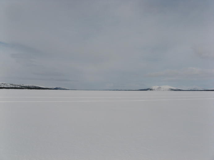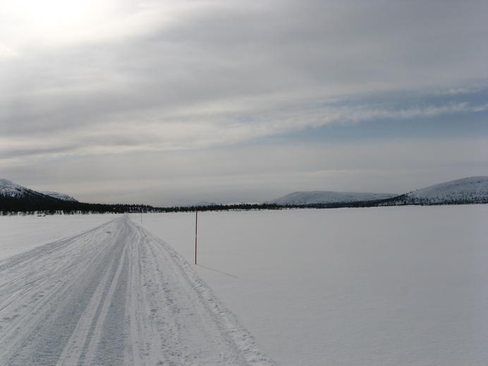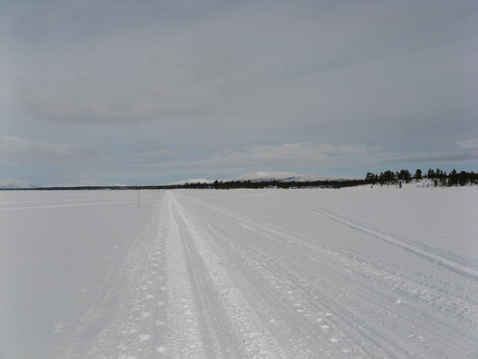 Die Eisfläche war ziemlich langweilig. Sehr flach und vor allem schien sie gar kein Ende nehmen zu wollen. Noch dazu gab es eine ordentliche Brise mit leichtem Schneefall geradewegs ins Gesicht. Andrerseits wäre die Aussicht auf den Bergen ringsherum bei dem Wetter auch kaum besser gewesen.