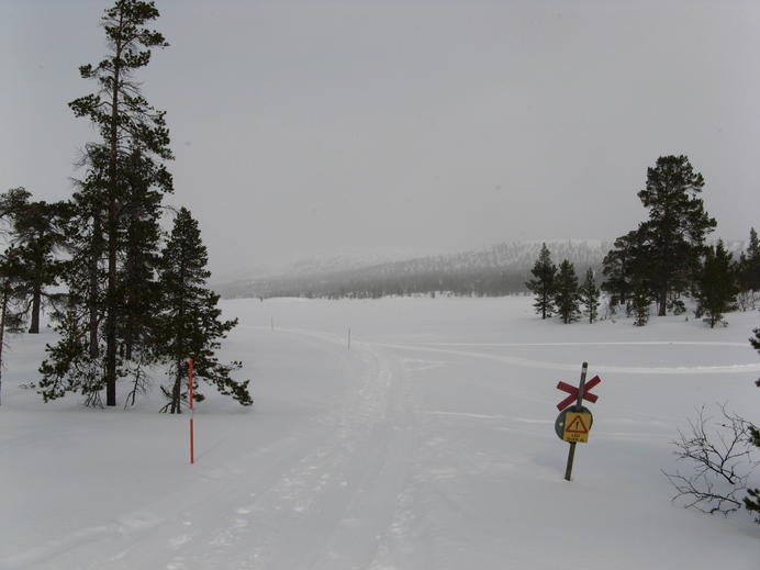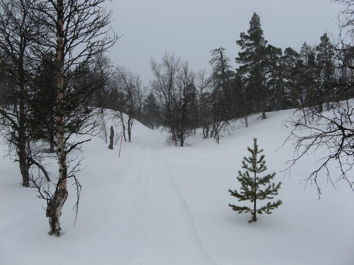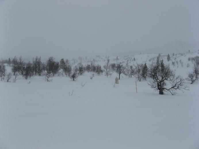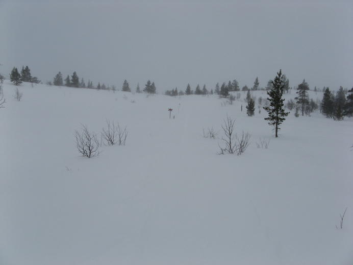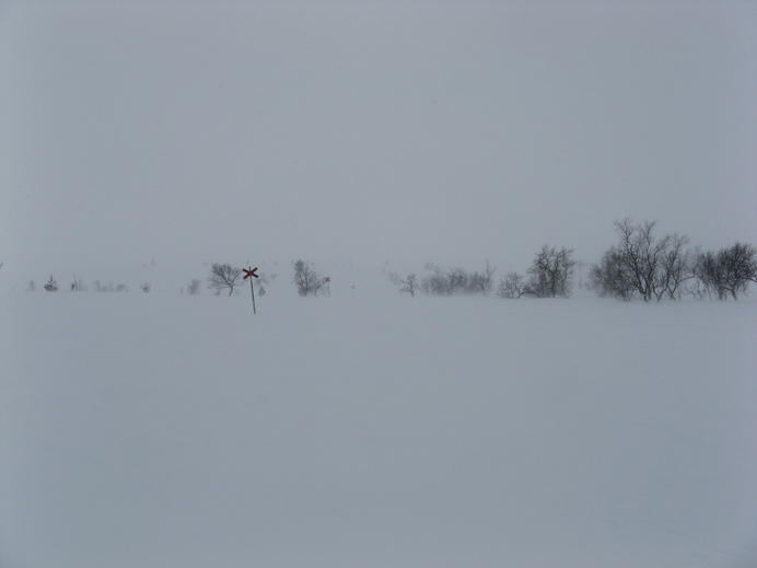 Schließlich überquerte ich irgendeine lokale Grenzlinie, die zugleich Grenze zwischen Rogens und Långfjällets naturreservat war, und außerdem in etwa mit der Baumgrenze übereinstimmte. Ab hier gab es mächtigen Wind mit Schneetreiben von vorne, und die Spur war schon so tief zugeweht, dass ich endlich mal wieder froh über meine Schneeschuhe war. In einem halben white-out erreichte ich schließlich die Hütte, mit GPS und Wegmarkierungen überhaupt kein Problem. Auch diese Hütte gehörte zum STF und hatte natürlich einen Warden und Supermarkt-Schrank.