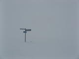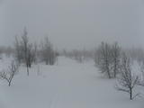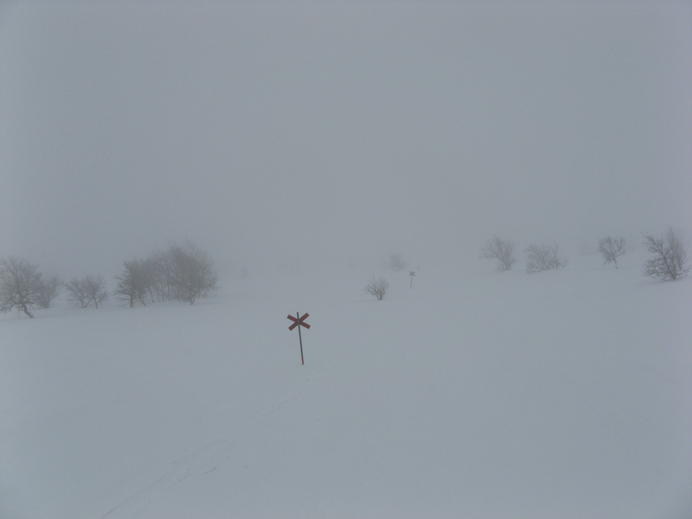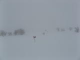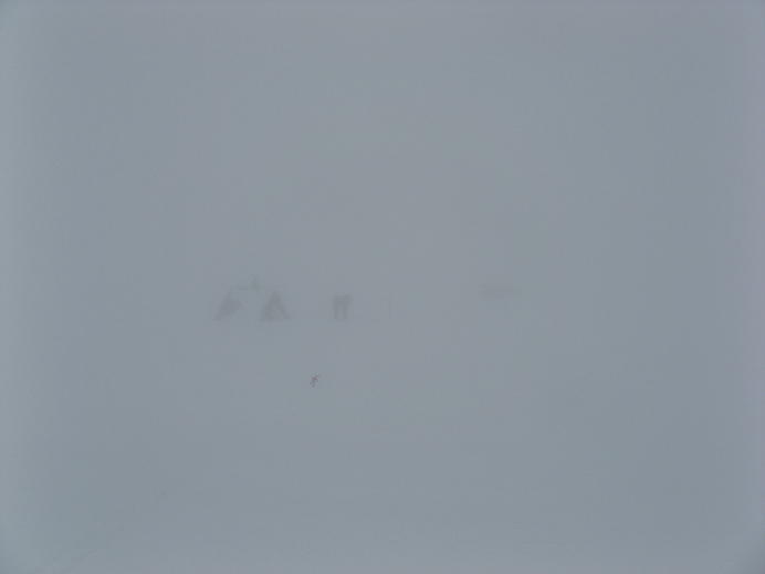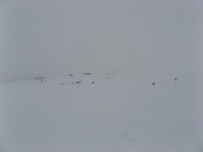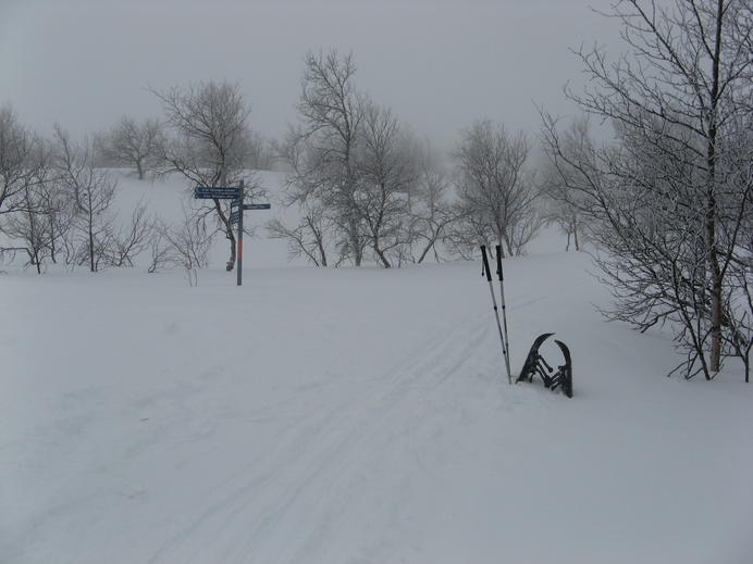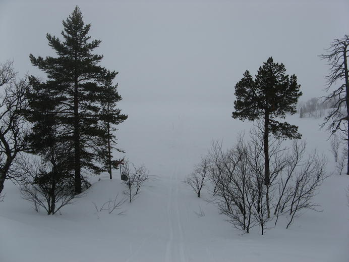 Aufbruch war also in einem white-out, aber auf den gut markierten schwedischen Skiloipen konnte man immer noch von einer Markierung zur nächsten schauen. So war es kein Problem, die Nothütte am Slagusjön zu erreichen, die als kleines, dreieckiges Hexenhäuschen aus dem Schnee schaute. Von dort an ging es bergab und wurde langsam auch wieder waldiger.