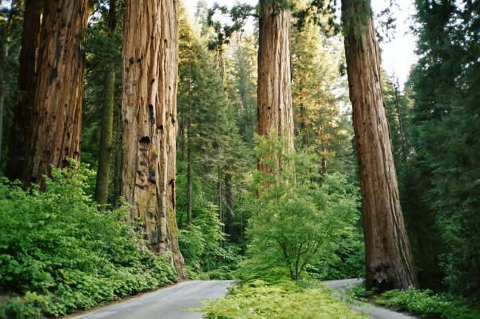 Eigenartige Gruppe von vier Sequoias und zwei Straßen