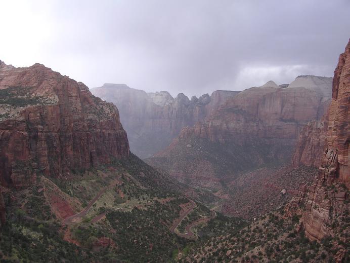 Rain in the Zion Canyon, seen from Canyon Overlook