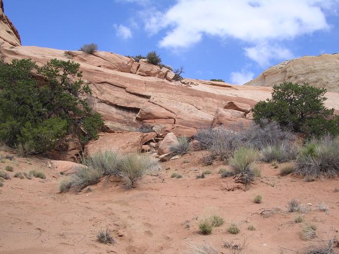 Rock and sands and a few shrubs in the Upper Muley Twist Canyon