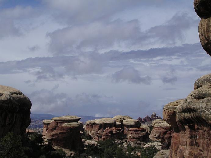 Die typischen Felsen des Chesler Park mit dunkeln Wolken darüber