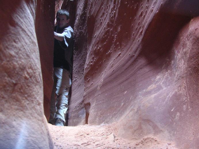 Olaf auf dem abenteuerlich engen Weg durch den Spooky Slot Canyon