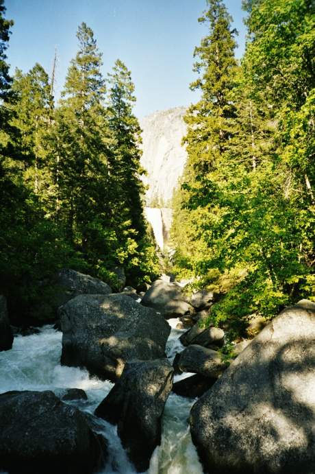 Postkartenansicht des Vernal Fall mit Regenbogen und allem